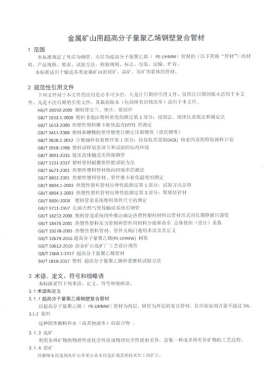 鋼制耐磨UHMWPE復(fù)合管,該復(fù)合管采用松襯復(fù)合,是以鋼管作為外層保護基體,內(nèi)襯UHMWPE管的一種復(fù)合管材。鋼制耐磨UHMWPE復(fù)合管在金屬礦山行業(yè)中主要用于鐵精粉、稀土、鈮、硫等礦物輸送和尾礦排放。由于輸送鐵精粉、稀土、鈮、釷等礦物介質(zhì)、顆粒度的不同,對鋼制耐磨UHMWPE復(fù)合管的要求也不同。UHMWPE*用料性能差異直接關(guān)系到其在鋼鐵行業(yè)應(yīng)用的安*性和可*性,為了規(guī)范整個行業(yè)市場,需對UHMWPE*用料、設(shè)計、制造和檢驗各環(huán)節(jié)制定相應(yīng)的要求和方法,規(guī)范行業(yè)市場,提升行業(yè)技術(shù)水平,推進行業(yè)規(guī)模*級。